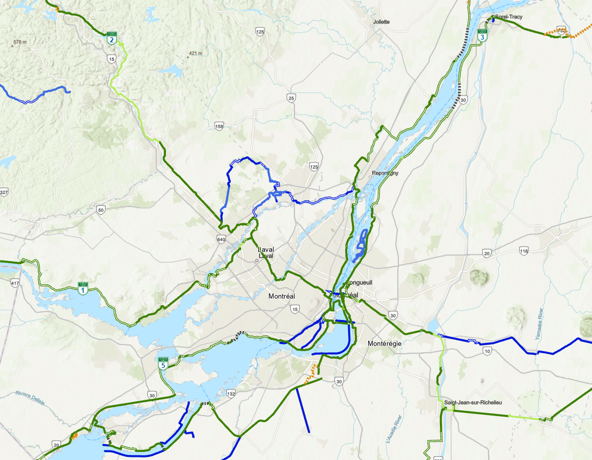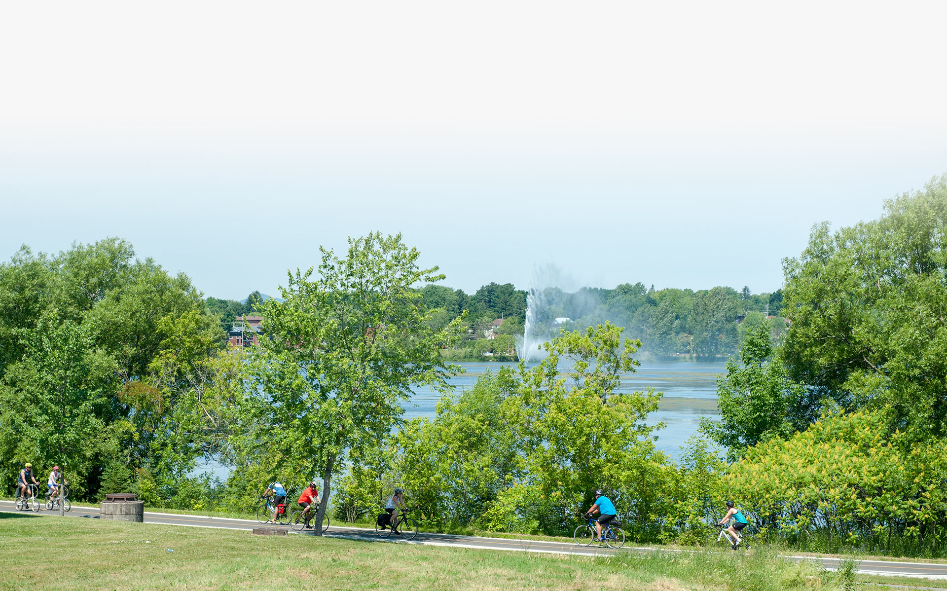 En longeant le fleuve Saint-Laurent et la 132 de Saint-Constant jusqu'à Varennes, La Riveraine permet de parcourir un environnement à la fois urbain et naturel, ponctué de parcs riverains, de points de vue sur Montréal et de lieux culturels et patrimoniaux.